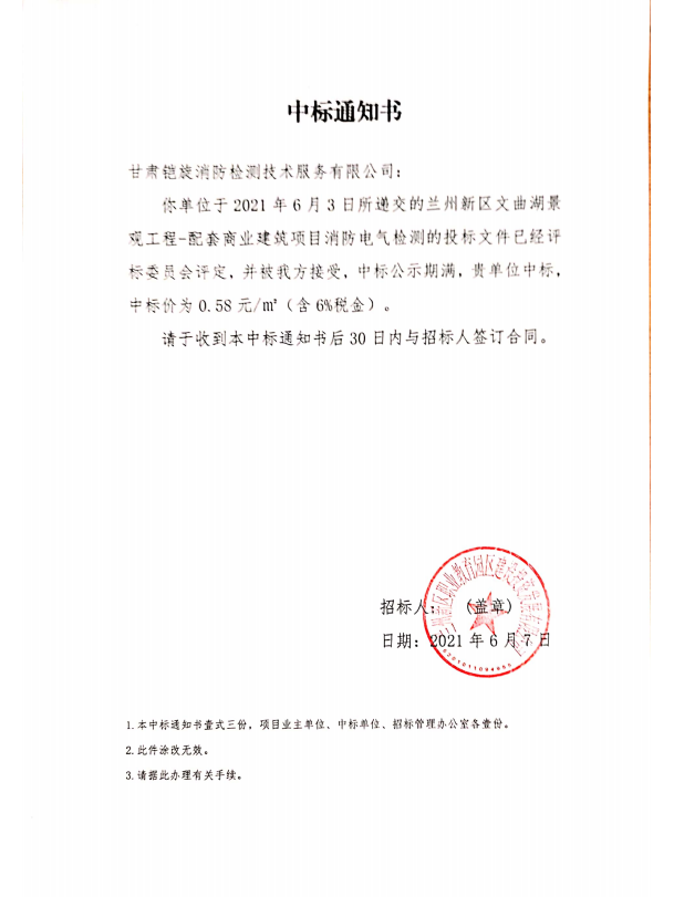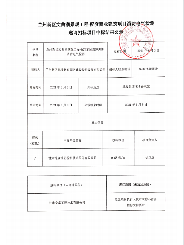 • 兰州新区文曲湖景观工程-配套商业建筑项目消防电气检测邀请招标项目中标结果公示