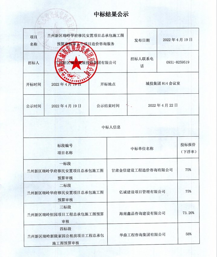 兰州新区瑞岭学府移民安顿项目总承包施工图预算审核等4个项目造价咨询效劳