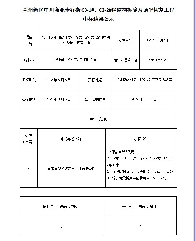 • 兰州新区中川商业步行街C3-1#、C3-2#钢结构拆除及场平恢复工程中标结果公示